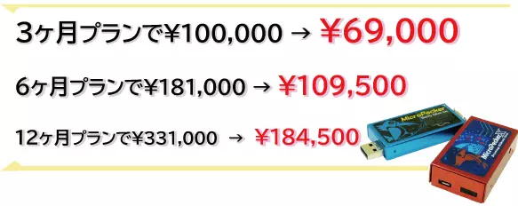MicroPeckerX製品・MicroPecker製品のレンタルサービスを2ヶ月以上ご利用いただくとレンタル料金が大幅にプライスダウン。 お客様が必要な期間だけ利用できるレンタルサービスですので、開発期間に合わせてご利用ください。